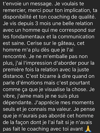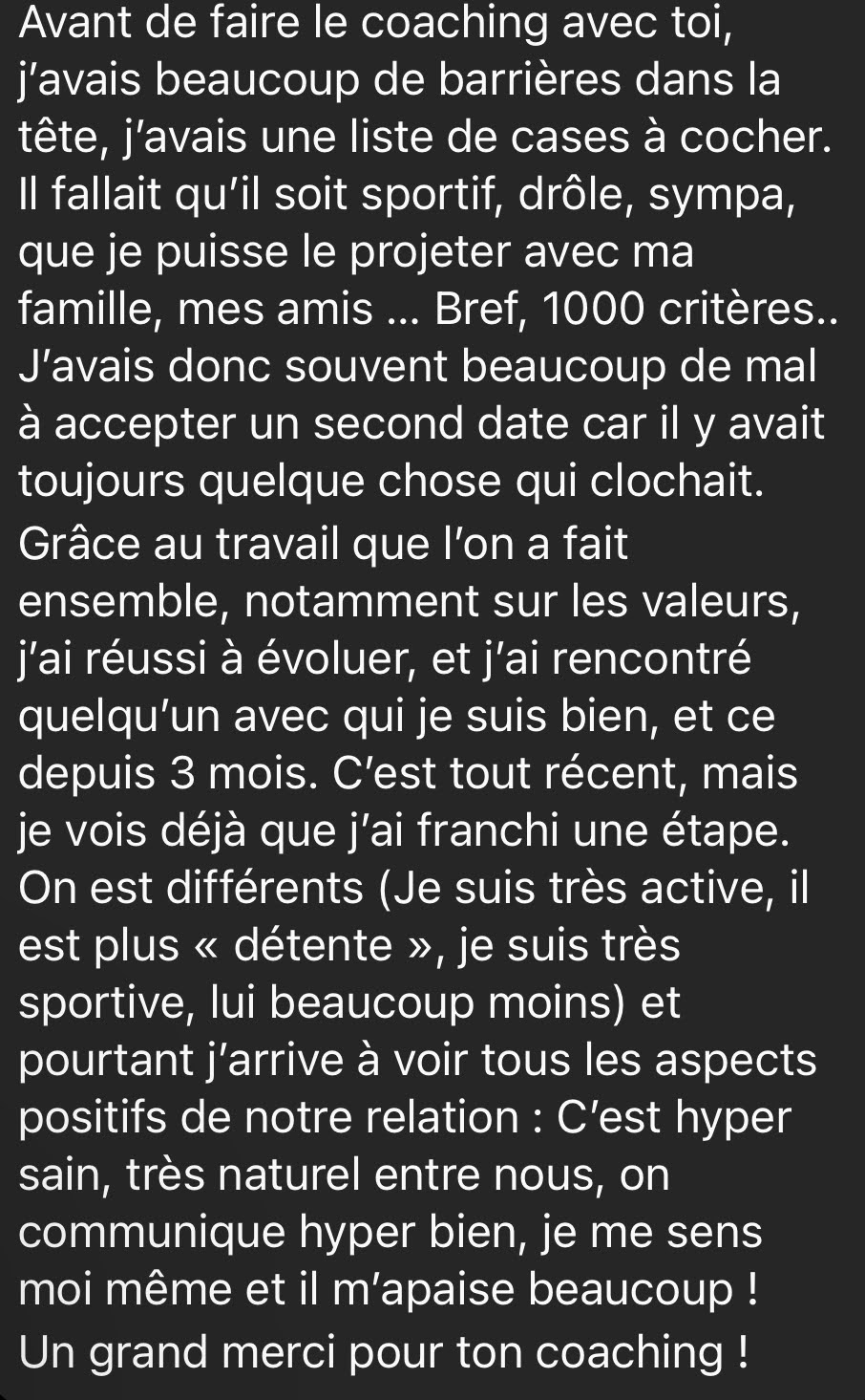 En plus de ça, on se retrouve 2 fois par mois pour que je t'accompagne sur le passage à l'action/le dating et une fois par mois pour discuter autour d'une des thématiques centrales de la méthodologie.**