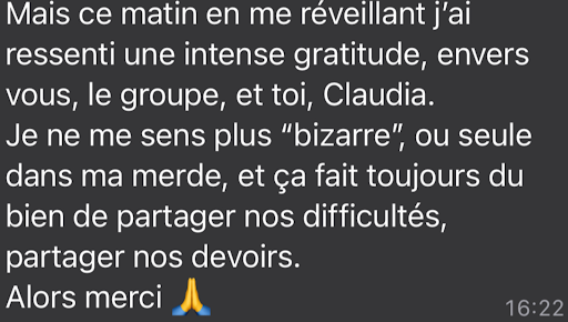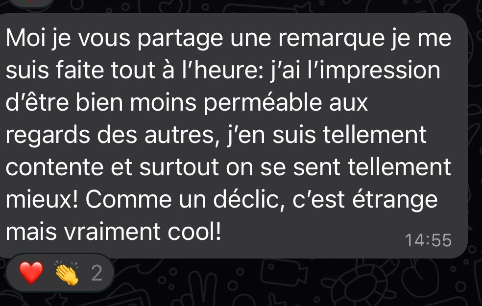 Tu as accès à moi via le chat du groupe 5 jours /7, pour avoir mon regard sur tes exercices, répondre à tes questions et te guider dans la mise en pratique.