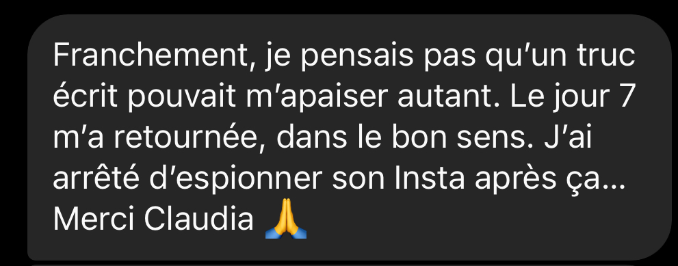 « J’étais en vrac après ma rupture. Ce programme m’a offert un cadre rassurant, jour après jour. J’ai pleuré, beaucoup… mais j’ai aussi commencé à respirer à nouveau. »